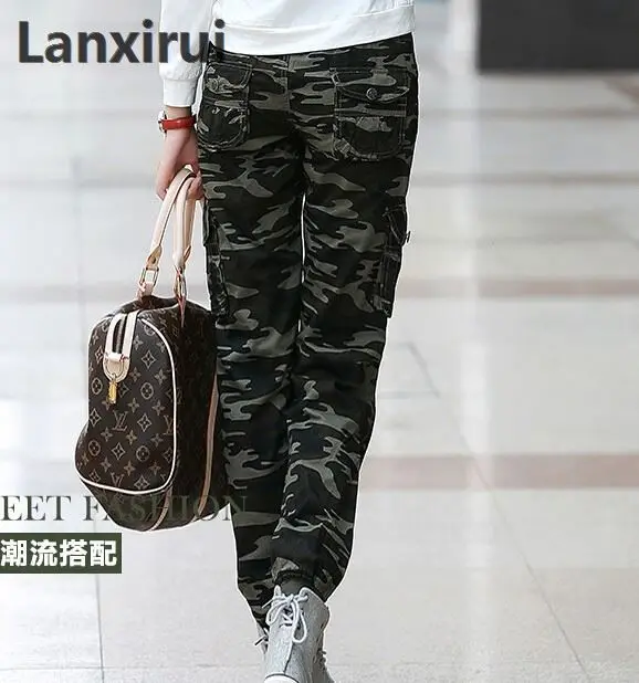 New Womens Fashion Casual Loose Camouflage Army Green Outdoors Cargo Pants Elastic Waist 100 %Cotto